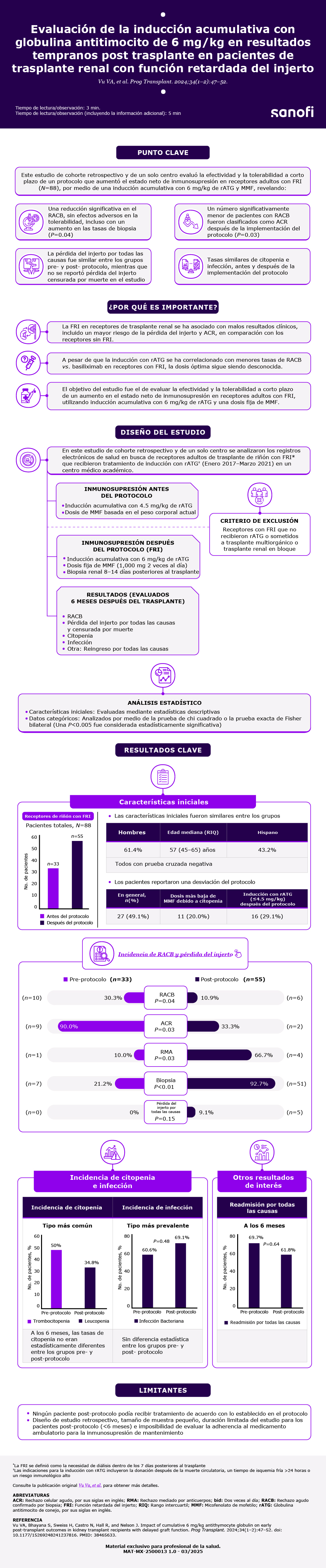 Vu VA, Bhayana S, Sweiss H, Castro N, Hall R, and Nelson J. Impact of cumulative 6 mg/kg antithymocyte globulin on early post-transplant outcomes in kidney transplant recipients with delayed graft function. Prog Transplant. 2024;34(1-2):47-52. doi: 10.1177/15269248241237816. PMID: 38465633.