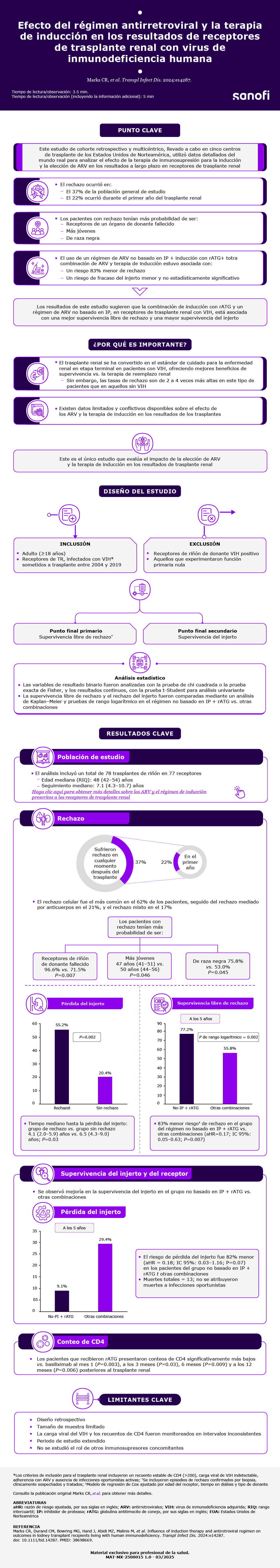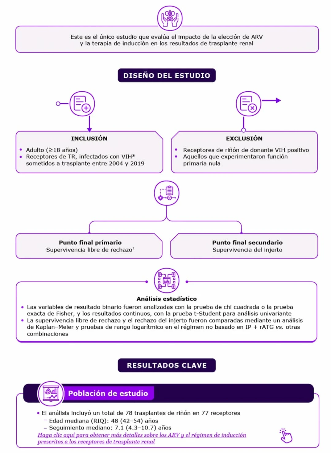 Este estudio de cohorte retrospectivo y multicéntrico, llevado a cabo en cinco centros de trasplante de los Estados Unidos de Norteamérica, utilizó datos detallados del mundo real para analizar el efecto de la terapia de inmunosupresión para la inducción y la elección de ARV en los resultados a largo plazo en receptores de trasplante renal
