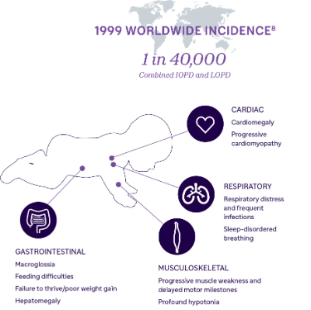 Pompe disease is a progressive, multi-systemic, debilitating, and often life-threatening neuromuscular disorder. Pompe disease is caused by the absence or deficiency of the enzyme acid alpha-glucosidase (GAA), which is responsible for the breakdown of glycogen inside the cells. Without sufficient GAA enzyme, glycogen accumulates primarily in muscle cells, which leads to progressive loss of muscle function. Infantileonset Pompe disease (IOPD) is rapidly progressing and usually presents within the first months of life. If left untreated, IOPD is often fatal before age 1.1