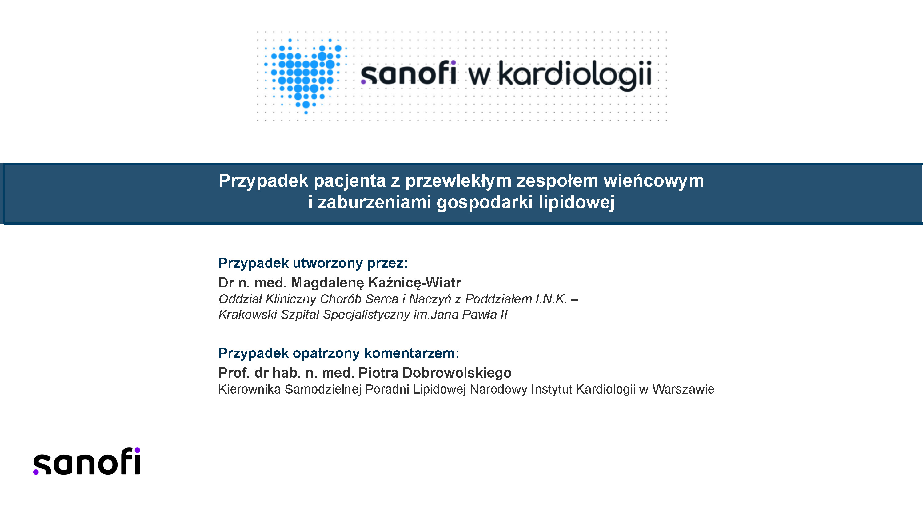 W ramach Kampanii Przypadki Kliniczne zapraszamy do zapoznania się z opisem przypadku pacjenta pacjenta z przewlekłym zespołem wieńcowym i zaburzeniami gospodarki lipidowej. Przypadek przygotowany przez: Dr n. med. Magdalenę Kaźnicę-Wiatr. Komentarz do przypadku: Prof. dr hab. n. med. Piotr Dobrowolski