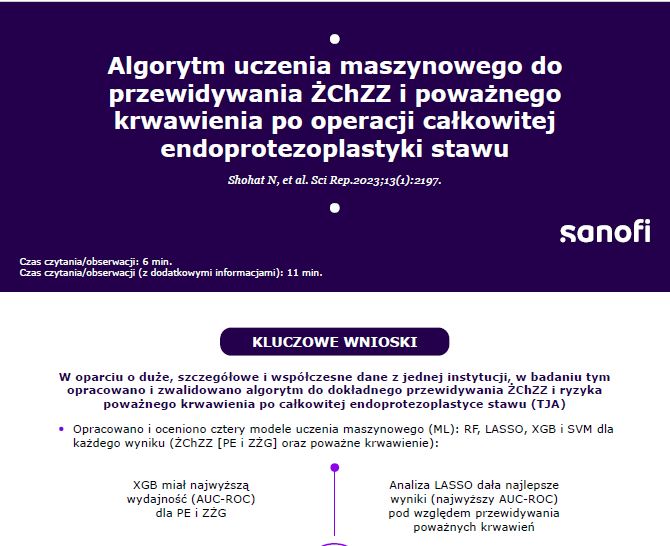 Algorytm uczenia maszynowego do przewidywania ŻChZZ i poważnego krwawienia po operacji całkowitej endoprotezoplastyki stawu