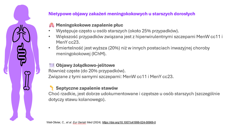 - Osoby starsze: częściej obserwuje się zapalenie płuc, objawy brzuszne oraz rzadkie formy, takie jak meningokokowe zapalenie komór mózgowych czy zapalenie nagłośni (epiglottitis).
