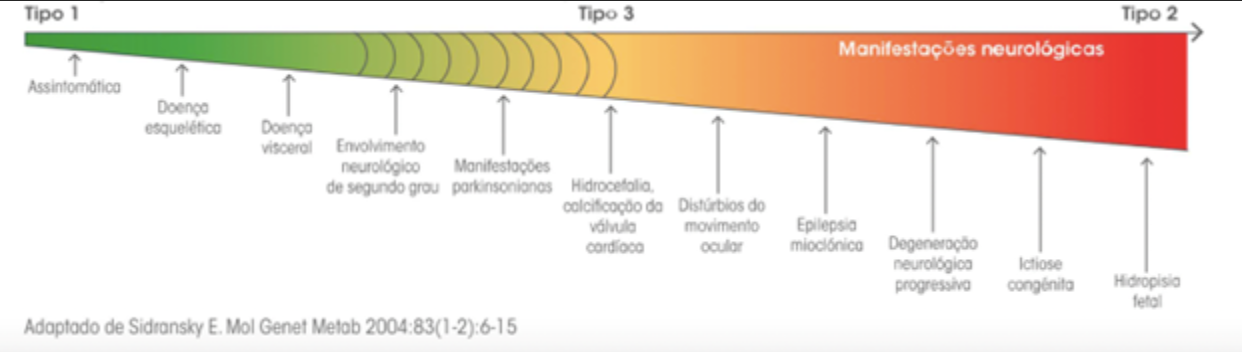 As categorias clássicas dos tipos 1, 2 e 3 têm as margens esbatidas ao longo do continuum da doença. Adaptado de Sidransky E, Gaucher disease: complexity in a "simple" disorder. Mol Genet Metab. 2004 Sep-Oct;83 (1-2):6-15.