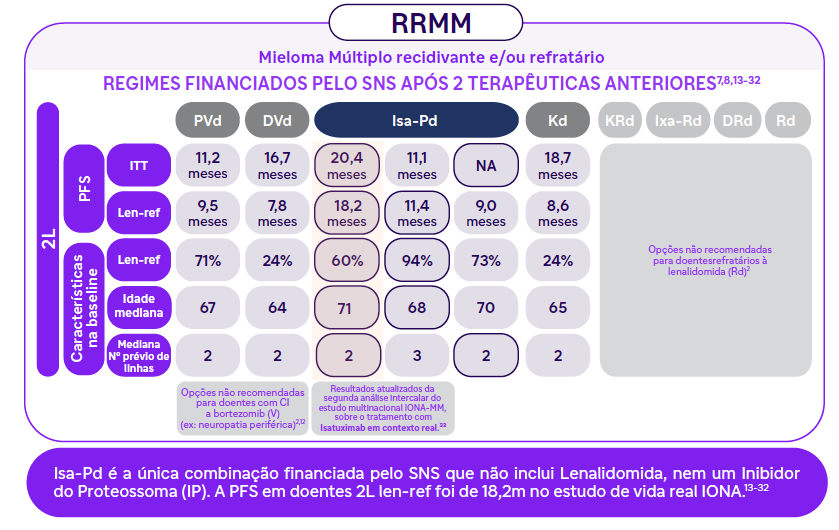 Isa-Pd é a única combinação 2L com anti-CD38 livre de lenalidomida (R) e IP com PFS de 11,4 meses em doentes len-ref e uma PFS 2L não atingida aos 14,2 meses de follow-up.13-31
