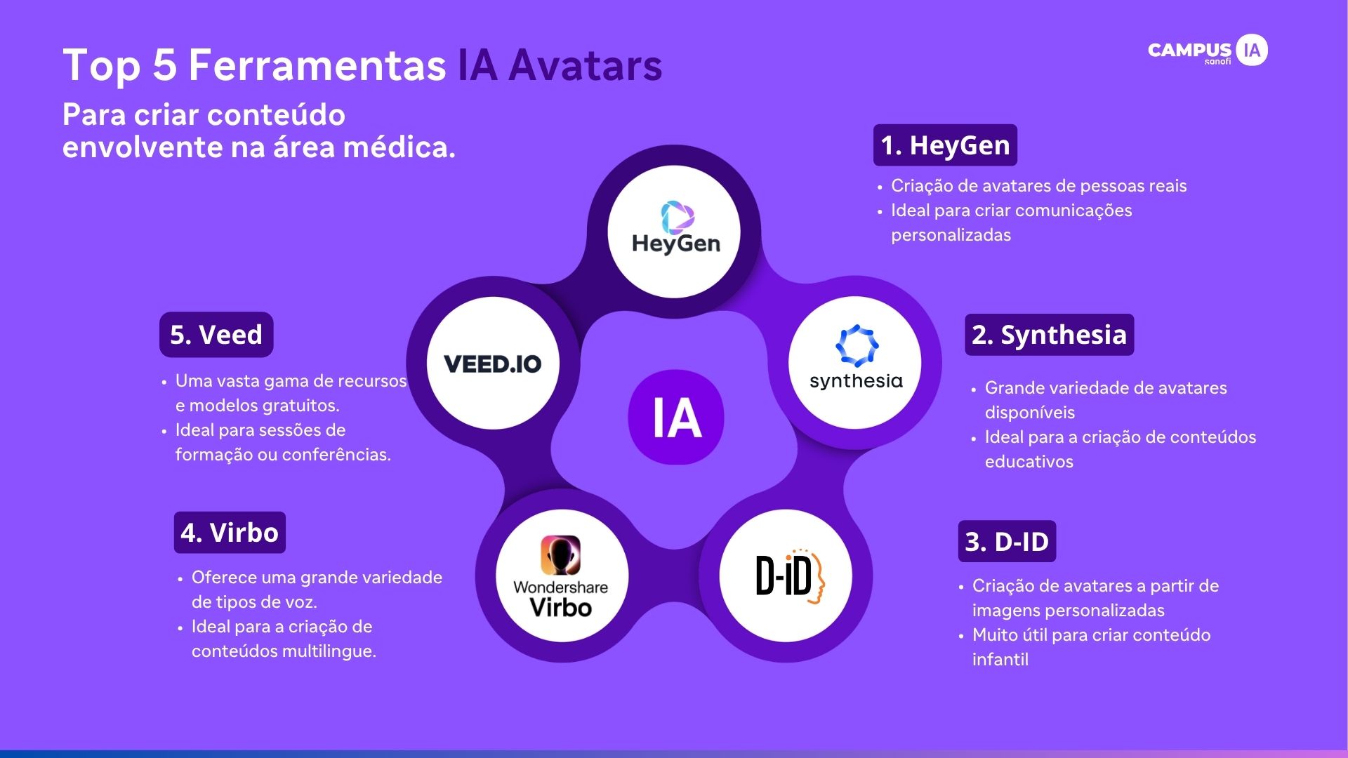 Materiais de formação médica: Estes avatares facilitam a criação de manuais interativos que detalham procedimentos médicos e algoritmos terapêuticos, melhorando a compreensão e a aprendizagem contínua dos profissionais de saúde. |