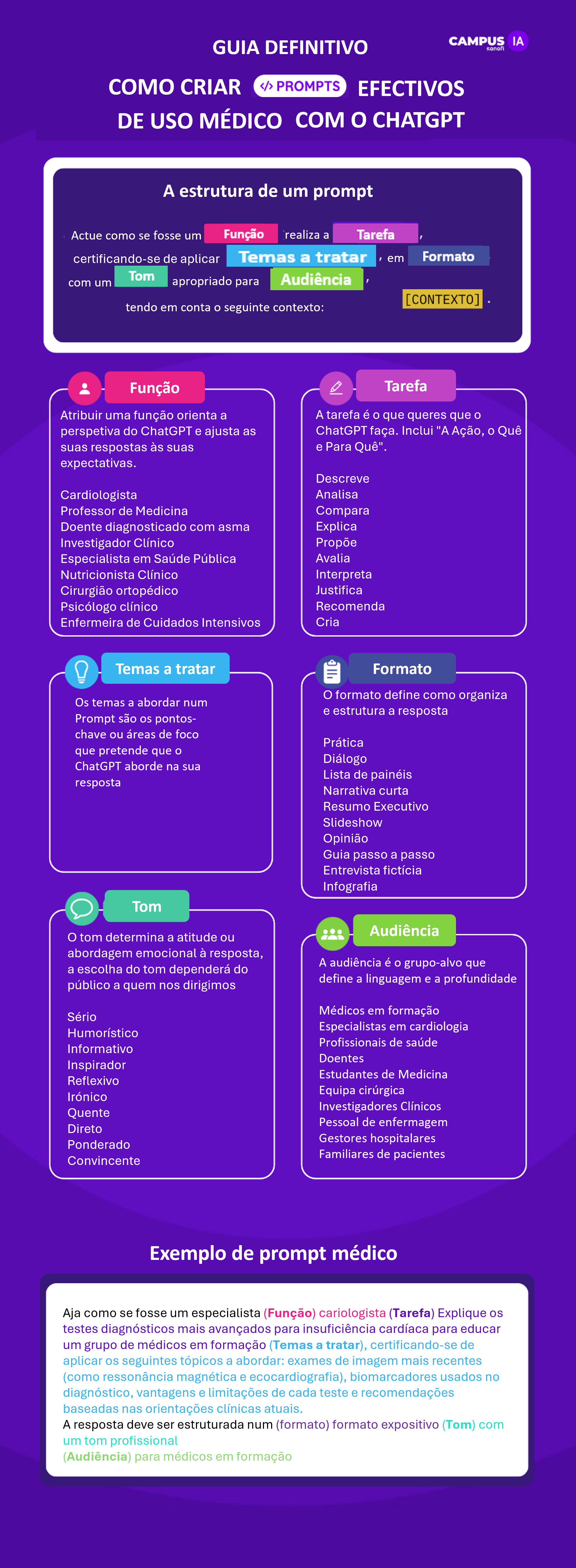 A formulação de um bom prompt influencia diretamente a qualidade da resposta. Quanto mais claro e estruturado for, melhor a IA será capaz de interpretar as suas necessidades, fornecendo resultados mais úteis e relevantes. Isto não apenas poupa o seu tempo, mas também aumenta a eficiência na sua prática diária, ajudando a fornecer cuidados mais eficazes e de maior qualidade aos seus doentes.