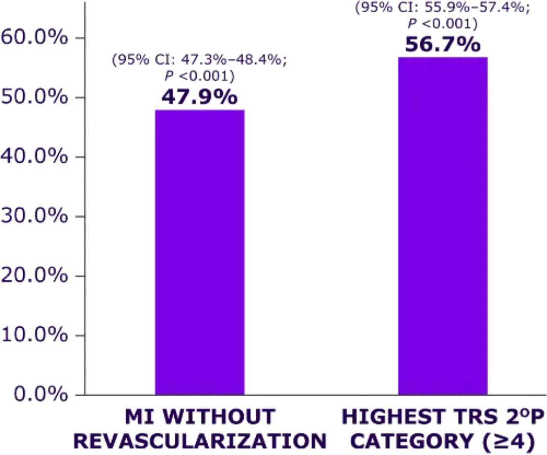 - Highest in subgroups such as MI without revascularization and Thrombolysis In Myocardial Infarction Risk Score for Secondary Prevention (TRS 2oP) ≥4