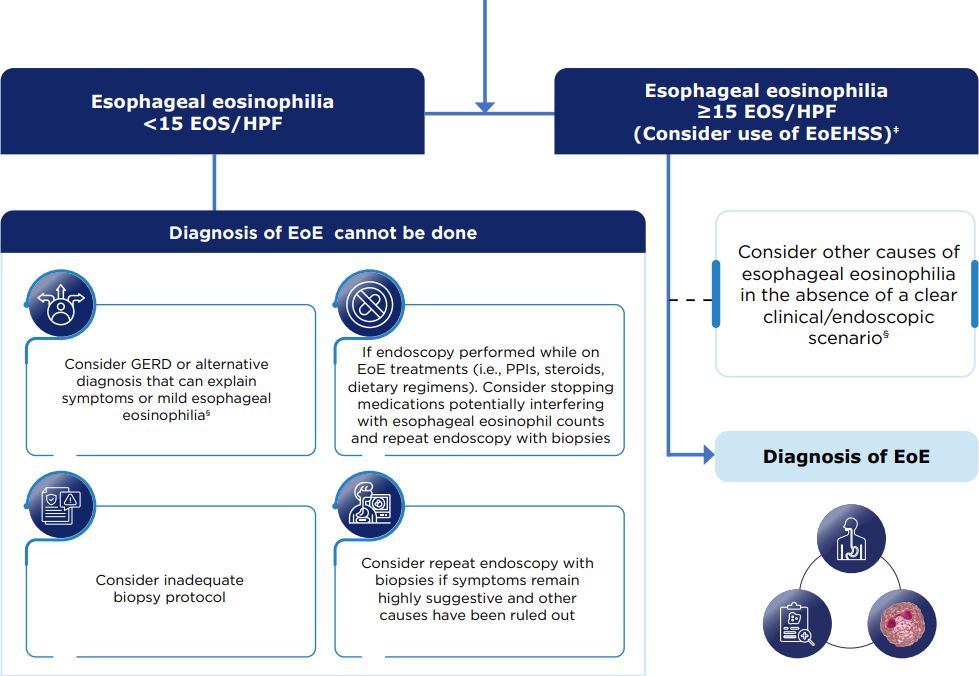 EoE, eosinophilic esophagitis; EoEHSS, EoE histologic scoring system; EREFS, EoE endoscopic reference score; EOS, eosinophils; GERD, gastroesophageal reflux disease; HPF, high-power field; PPI, proton pump inhibitor.