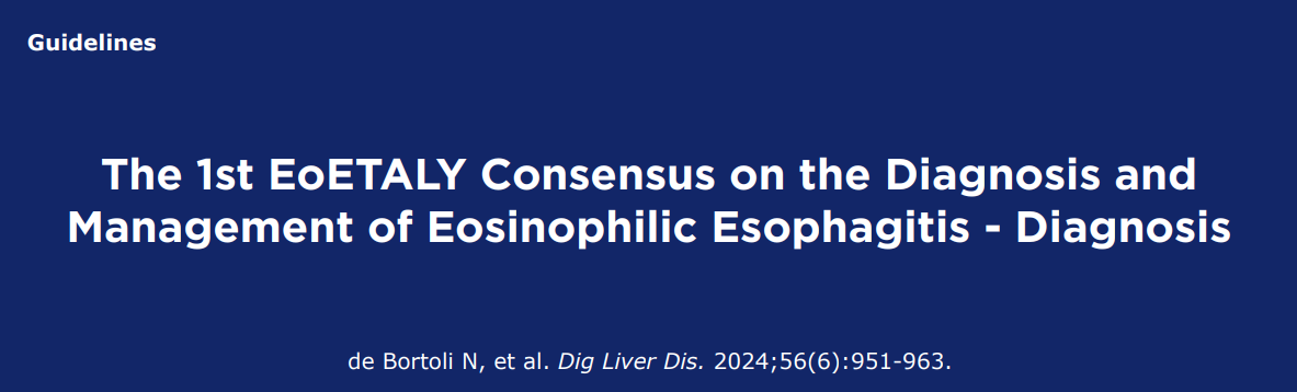 de Bortoli N, Visaggi P, and Penagini R, et al. The 1st EoETALY Consensus on the Diagnosis and Management of Eosinophilic Esophagitis - Definition, Clinical Presentation and Diagnosis. Dig Liver Dis. 2024;56(6):951-963.