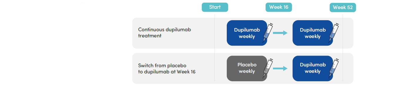 - At 16 weeks and over 52 weeks of treatment, dupilumab led to: