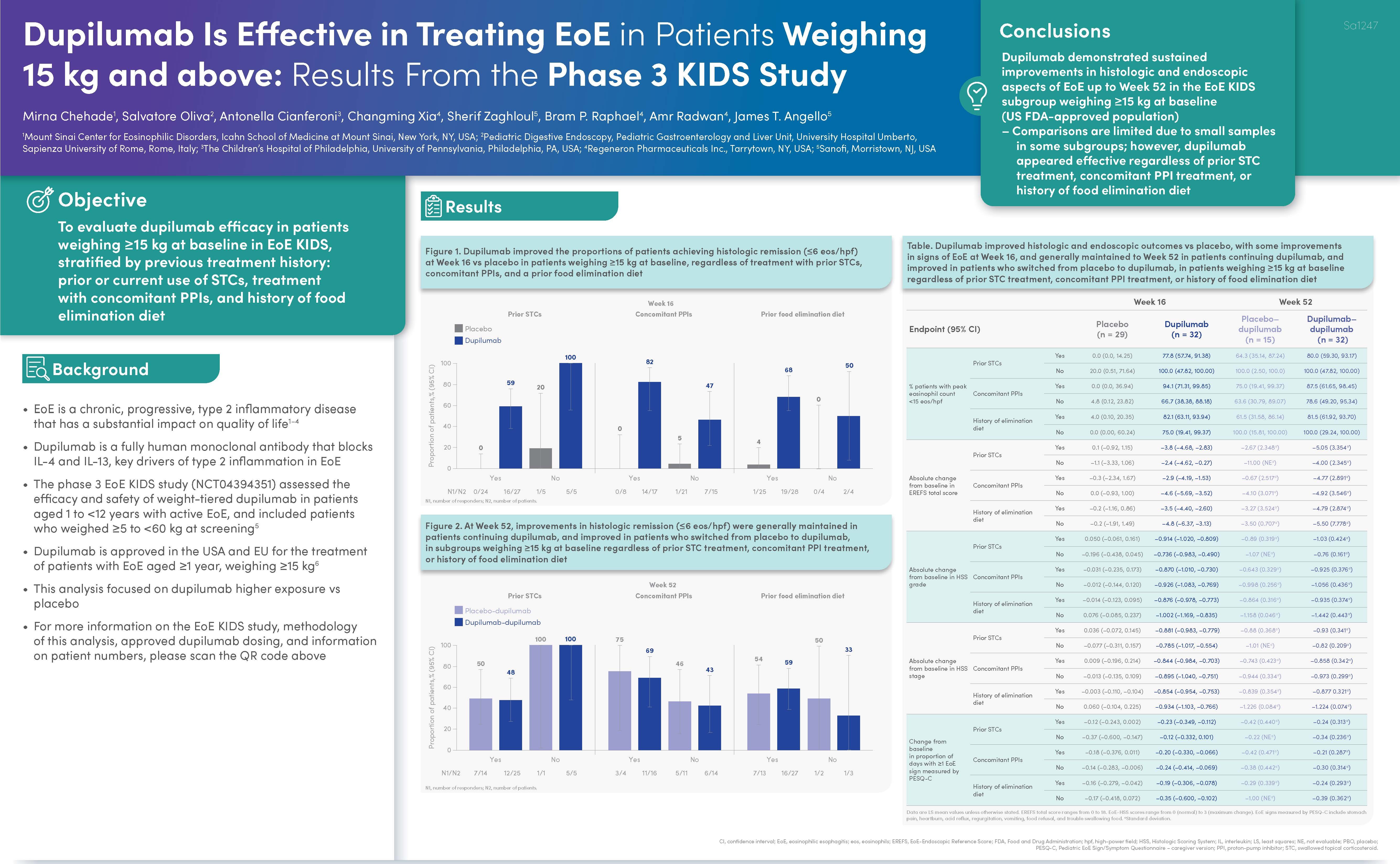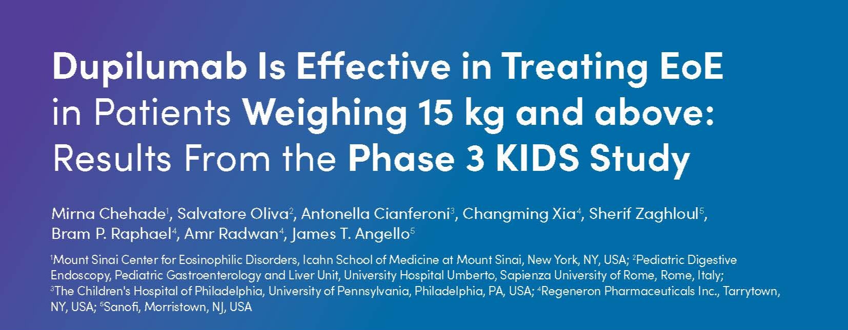 Chehade M, et al. Dupilumab is Effective in Treating EoE in Patients Weighing ≥15 kg: Results from the Phase 3 EoE KIDS Study. Presented at Digestive Diseases Week (DDW) 2025: San Diego, CA, USA; May 3–6, 2025.