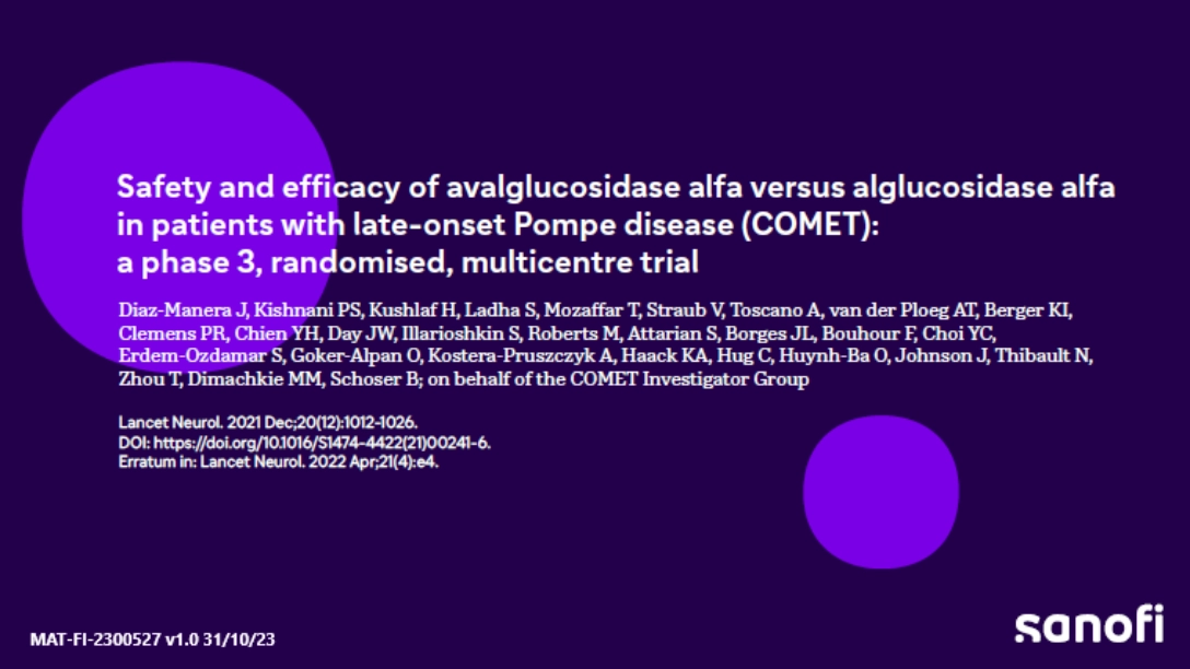 Diaz-Manera J, Kishnani PS, Kushlaf H et al. Safety and efficacy of avalglucosidase alfa versus alglucosidase alfa in patients with late-onse Pompe disease (COMET): a phase 3, randomized, multicenter trial. Lancet Neurol 2021; 20; 1012-26.