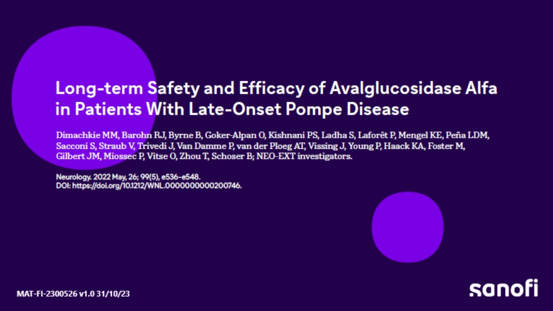 Dimachkie M, Barohn R, Byrne B et al. Long-term Safety and Efficacy of Avalglucosidase Alfa in Patients With Late-Onset Pompe Disease. Neurology 2022, May 26, DOI: 10.1212/WNL.0000000000200746