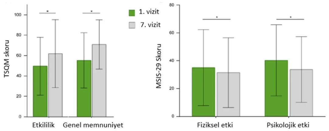 - TSQM etkililik ve global memnuniyet skorları 7. vizitte 1. vizitten anlamlı derecede yüksek bulunmuştur. Birinci ve 7. vizitlerde istenmeyen etkiler ve uygulama kolaylığı açısından anlamlı fark saptanmamıştır.