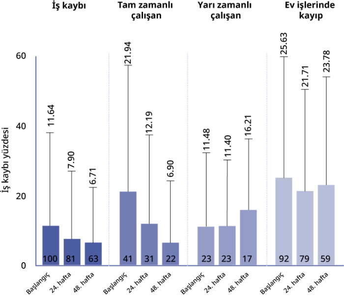En kayda değer gelişme tam zamanlı çalışanlarda görüldü. İş kaybında başlangıca kıyasla 48. haftada %70 azalma bildirilmiştir.