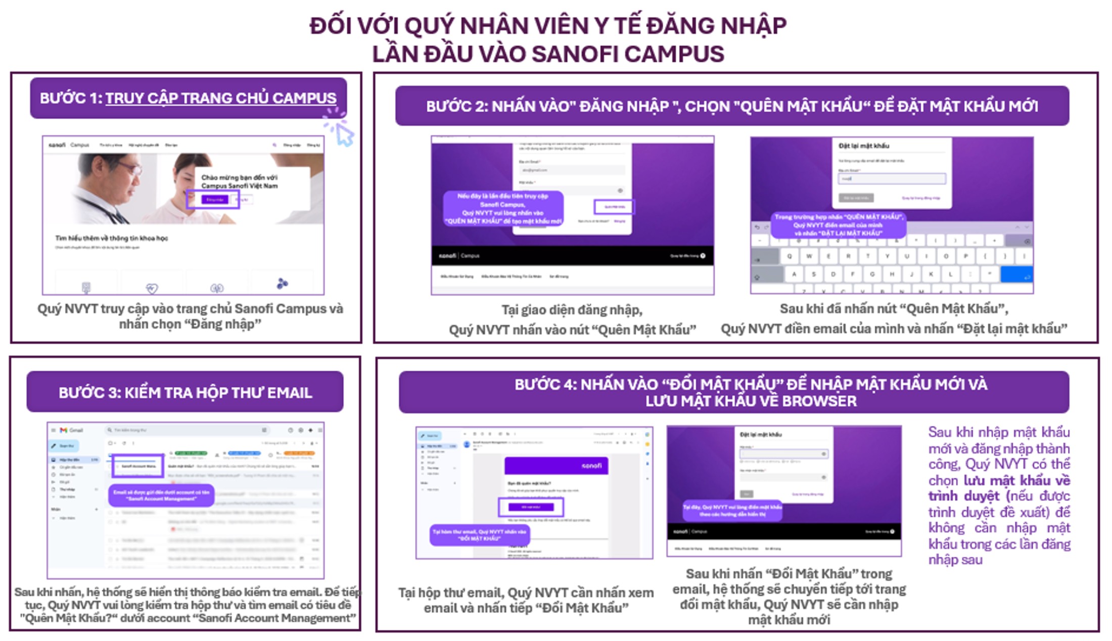 Quý Nhân viên y tế thực hiện theo các bước sau để lấy lại mật khẩu đăng nhập vào Campus Sanofi: