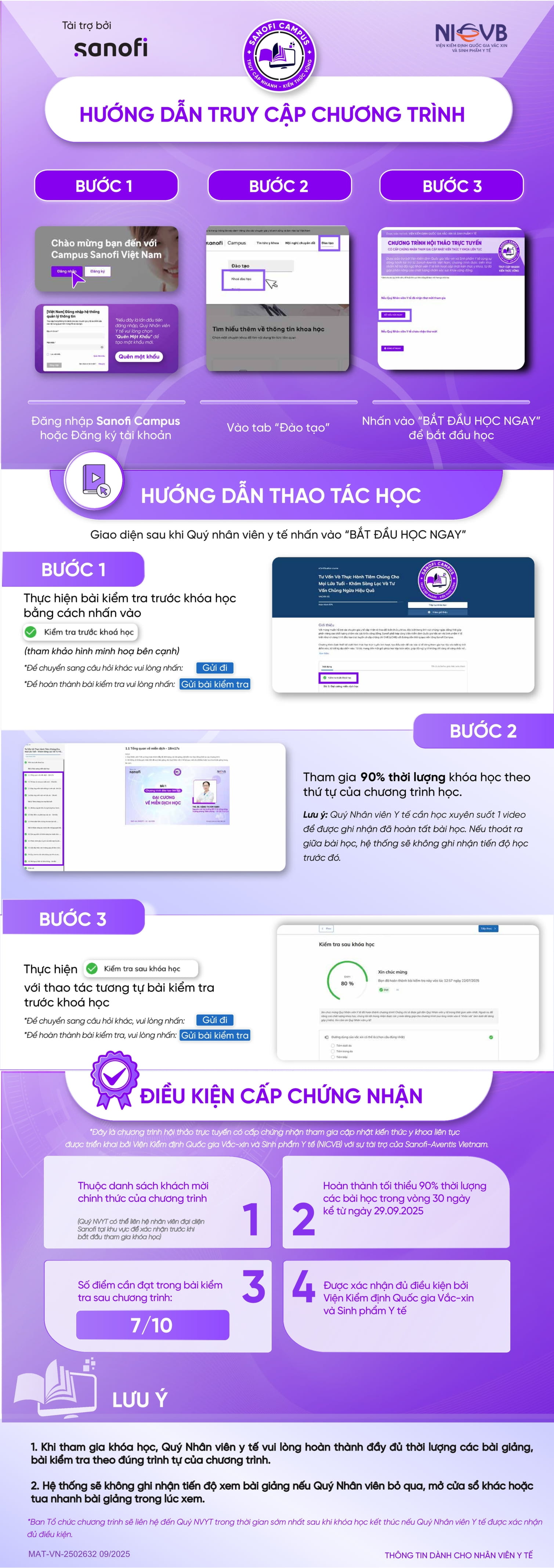 Để đăng ký tham gia khóa học, Quý Nhân viên y tế có thể liên hệ nhân viên đại diện của Sanofi trong khu vực của Quý Nhân viên y tế.
