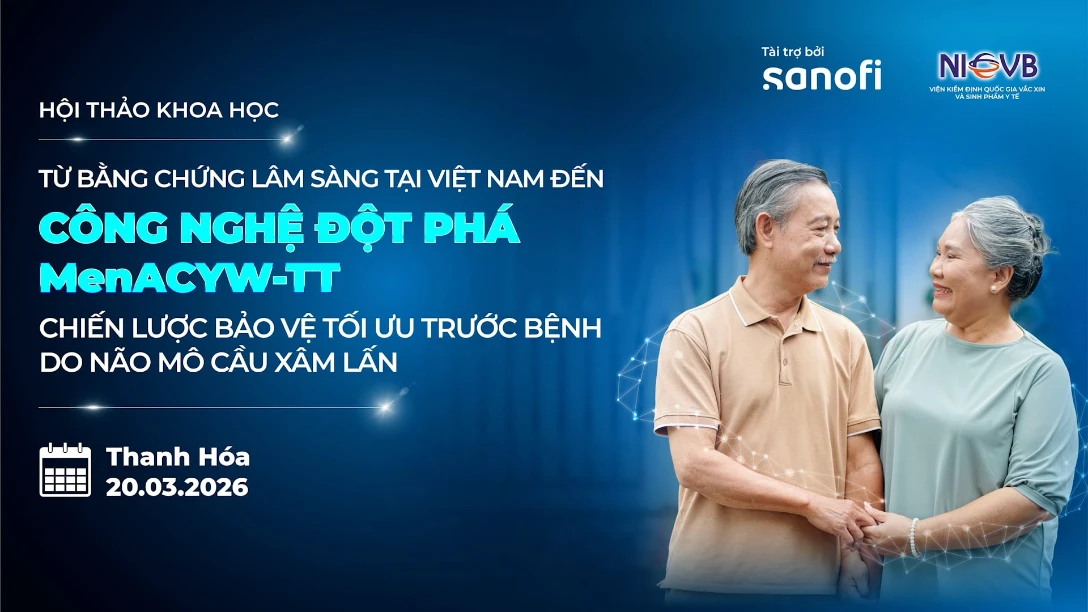 Viện Kiểm định Quốc gia Vắc xin và Sinh phẩm Y tế và Công ty TNHH Sanofi-Aventis xin chân thành cảm ơn Quý Cán bộ Y tế đã dành thời gian tham dự buổi Hội thảo khoa học “TỪ BẰNG CHỨNG LÂM SÀNG TẠI VIỆT NAM ĐẾN CÔNG NGHỆ ĐỘT PHÁ MENACYW-TT: CHIẾN LƯỢC BẢO VỆ TỐI ƯU TRƯỚC BỆNH DO NÃO MÔ CẦU XÂM LẤN” diễn ra từ 18:30 đến 20:30 ngày 20/03/2026.