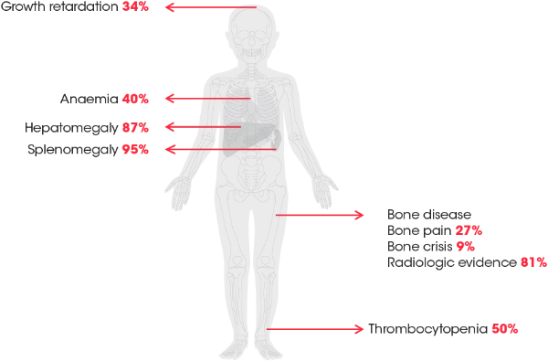 - Gaucher disease in children mimics the signs and symptoms of haematological malignancies1,2,5,7-15.